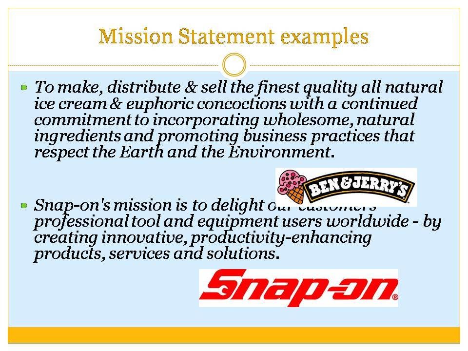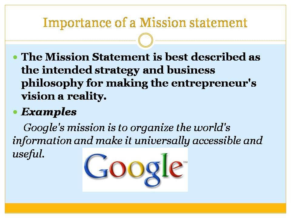 The Mission Statement is best described as the intended strategy and business philosophy for making the entrepreneur's vision a reality.