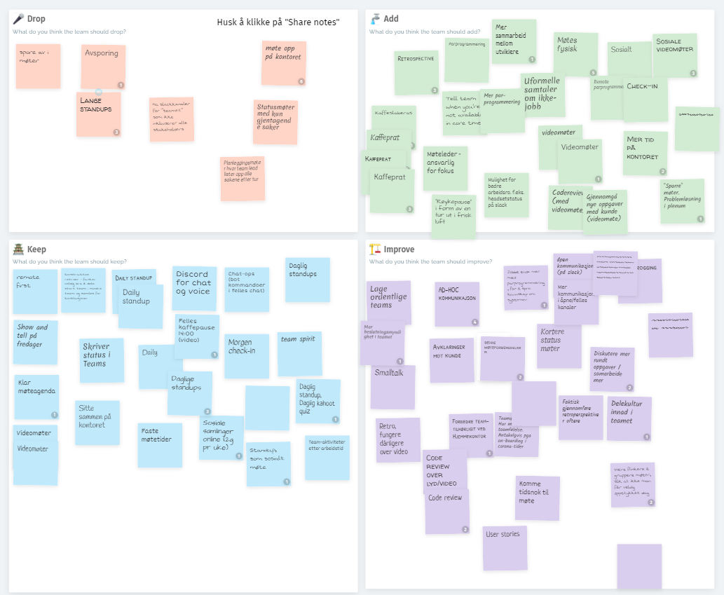For å justere måten de jobber på har teamet et retrospective hvor de diskuterer ha som er bra, dårlig osv.