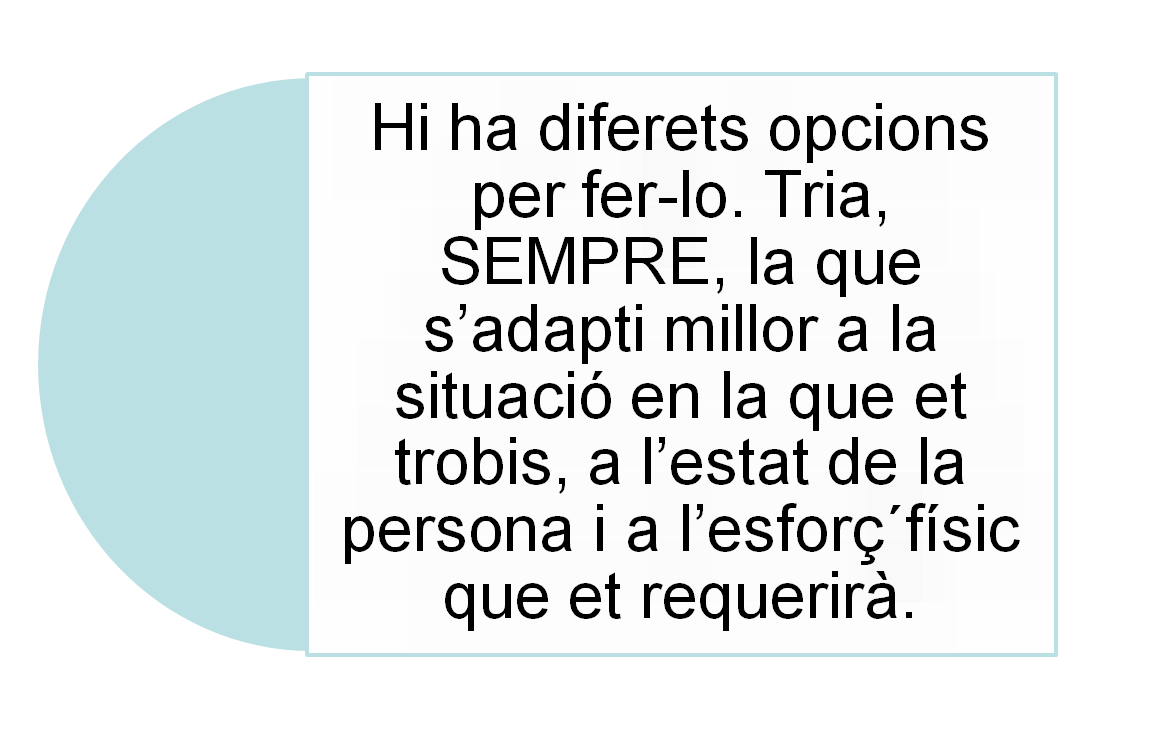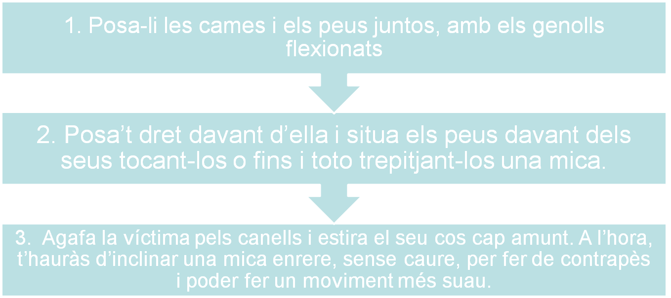 - • Per posar-la dempeus amb seguretat partiràs de la posició de la víctima asseguda en el terra: