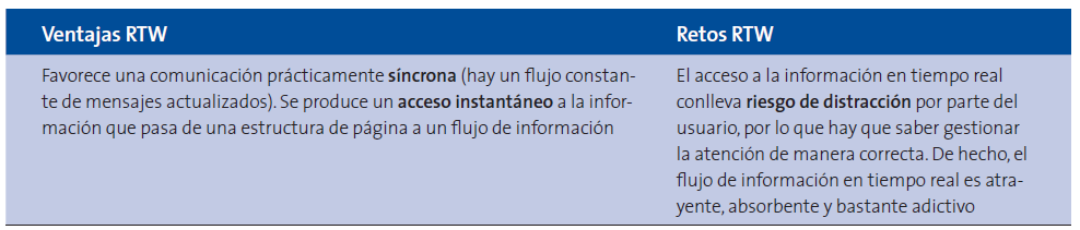 Conlleva una comunicación fluida, constante e instantánea, al mismo tiempo que se convierte en permanente. Las comunicaciones de la RTW son además en gran medida públicas y de carácter social, lo que precisamente apoya la difusión exponencial de la información, que previamente ha sido filtrada por los usuarios. Posee una tipología múltiple, como se ha comentado: textos, imágenes, vídeos, sonidos o incluso información contextual, como la de geolocalización del usuario.