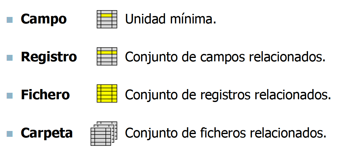 En los ficheros la información se almacena en unas unidades llamadas registros, cada uno de los cuales a su vez consta de varios campos.