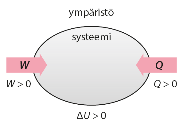 - Systeemiin siirtyvä lämpö ja systeemiin tehty työ ovat positiivisia eli Q > 0 ja W > 0