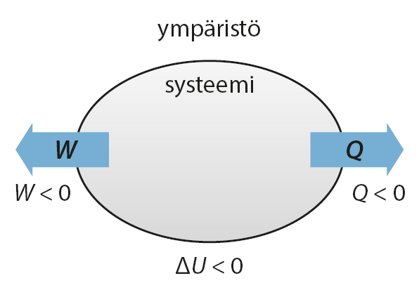 - Systeemistä pois siirtyvät lämpö ja ympäristöön tehty työ ovat negatiivisia eli Q < 0 ja W < 0
