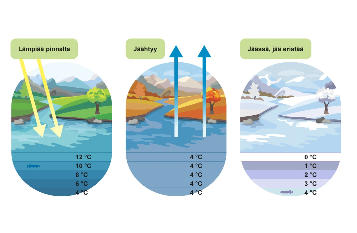 - Veden tilavuus on pienimmillään +4 °C:ssa (tiheys suurimillaan)