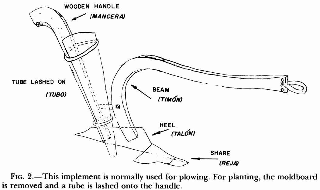 Indigenous to Temascalcingo, Mexico the sembradora was adapted from the plow. The moldboard was removed, so soil was no longer overturned into furrows. This retained soil moisture and decreased the likelihood of desertification. A tube formed from the maguey leaf (Agave americana) allowed the farmer to deposit seeds at desired intervals, determined by microclimatic conditions and the farmer's knowledge of their land. An adjustable plowshare allowed the farmer to plant seeds at variable depths contingent upon recent rainfall, groundwater levels, and microvariations in soil properties within the plot.