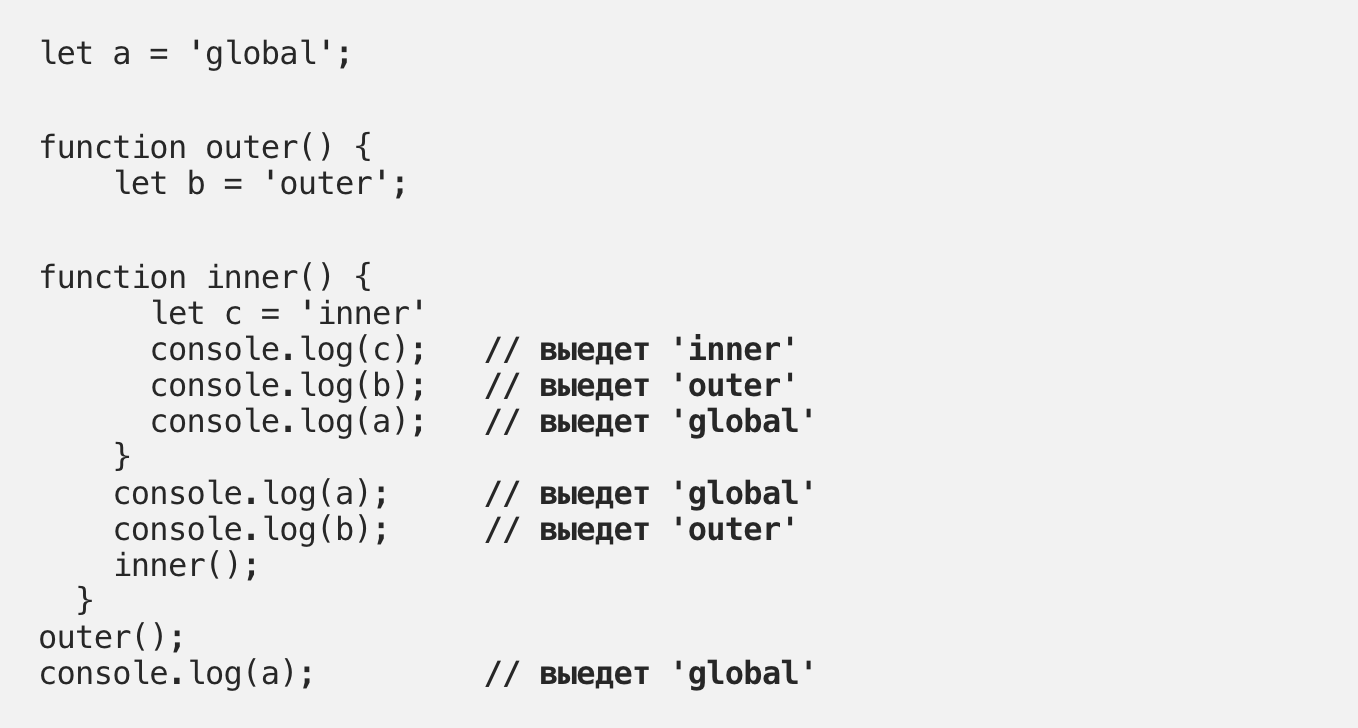 Обратите внимание, что функция inner окружена лексической областью видимости функции outer, которая, в свою очередь, окружена глобальной областью видимости. Поэтому функция innerимеет доступ к переменным, определенным в функции outer и глобальной области видимости.
