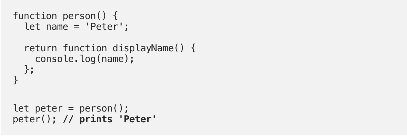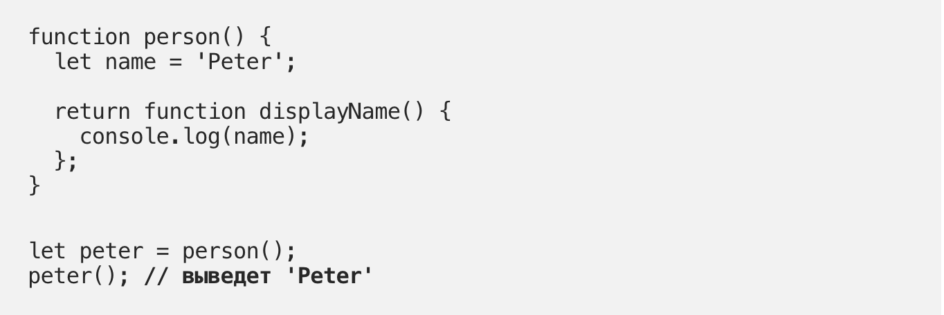 В этом примере мы вызываем функцию person, которая возвращает внутреннюю функцию displayName и сохраняет эту внутреннюю функцию в переменную peter. Когда мы вызываем функцию peter(которая на самом деле ссылается к функции displayName), имя “Peter” выводится в консоль.