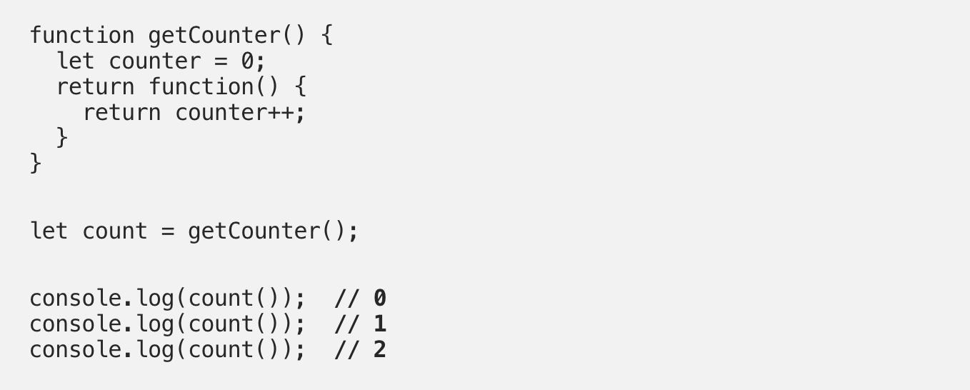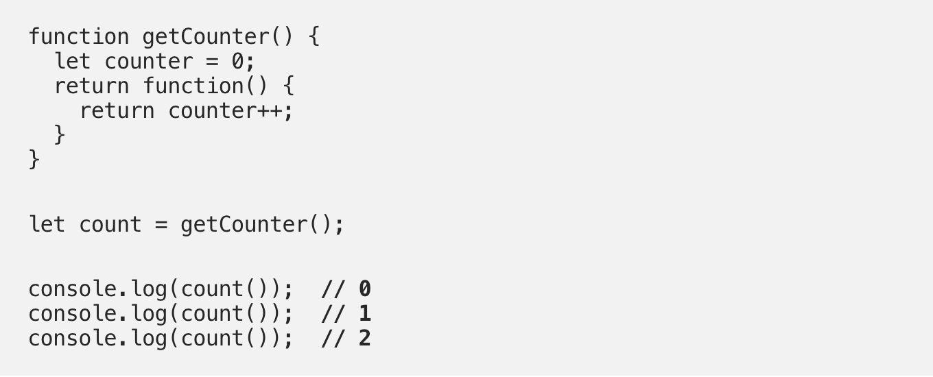 И снова, мы храним анонимную внутреннюю функцию, возвращенную функцией getCounter в переменной count. Так как функция сount теперь замыкание, она может получать доступ к переменной counter в функции getCounter, даже после того, как та завершится.