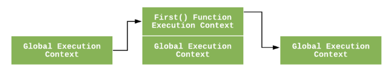 1) Во время выполнения этого кода, движок JavaScript создаёт глобальный контекст вызова, для того, чтобы выполнить глобальный код и когда он доходит до вызова функции first(), он создаёт новый контекст выполнения для этой функции и ставит её на вершину стека вызовов.