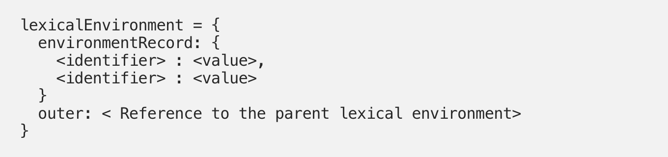 Лексическое окружение это структура данных, которая хранит информацию по идентификаторам переменных. Тут идентификатор обозначает имя переменных/функций, а переменная настоящий объект[включая тип функции] или примитивное значение.