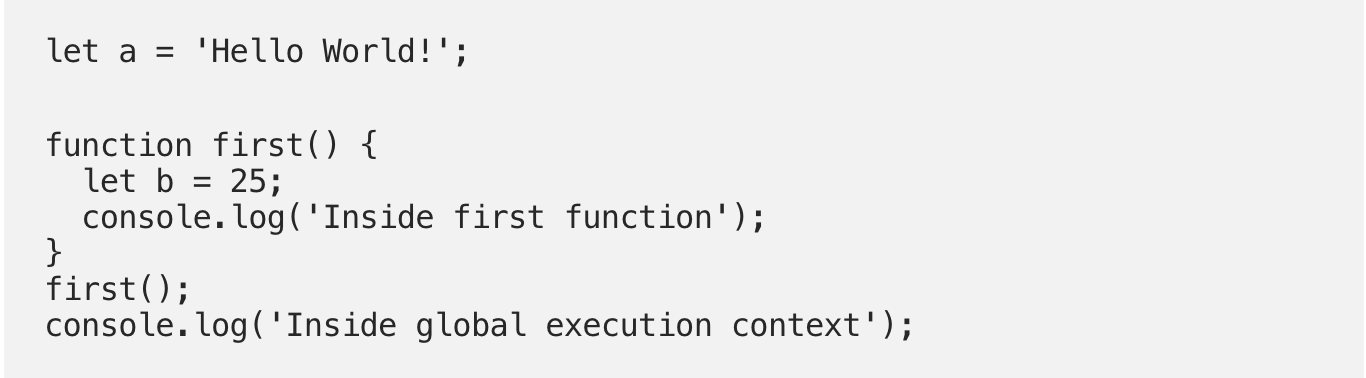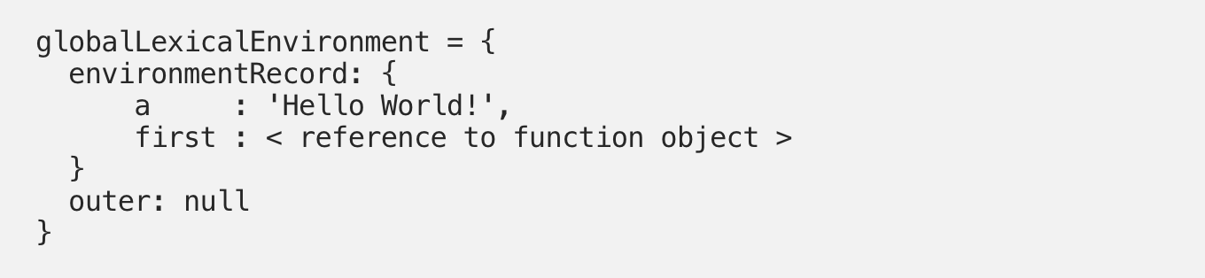Когда движок создаёт контекст выполнения для функции first(), он также создаёт лексическое окружение для хранения переменных, объявленных в этой функции во время выполнения. Таким образом, лексическое окружение функции будет выглядеть вот так