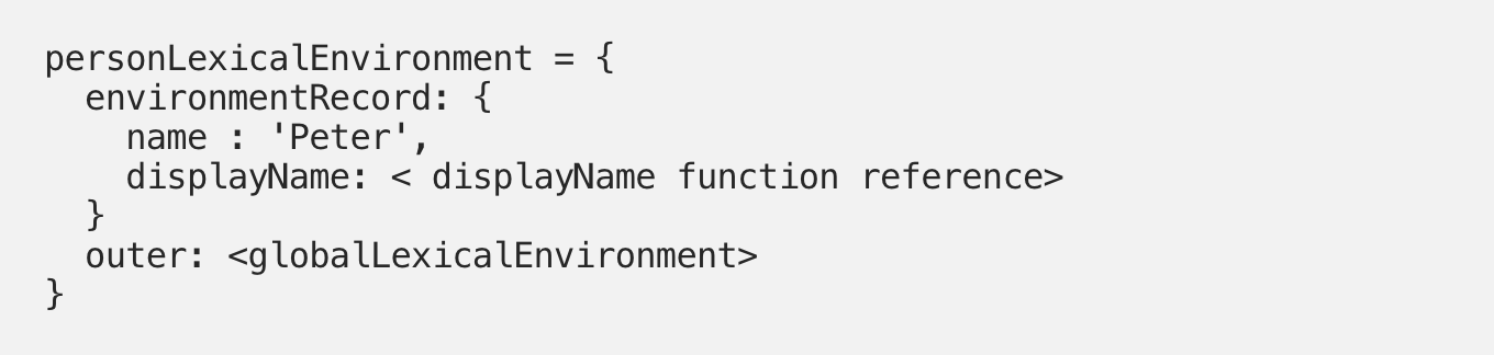 При выполнении функции peter (которая на самом деле является отсылкой к функции displayName), JavaScript создаёт новый контекст выполнения и лексическое окружение для этой функции.