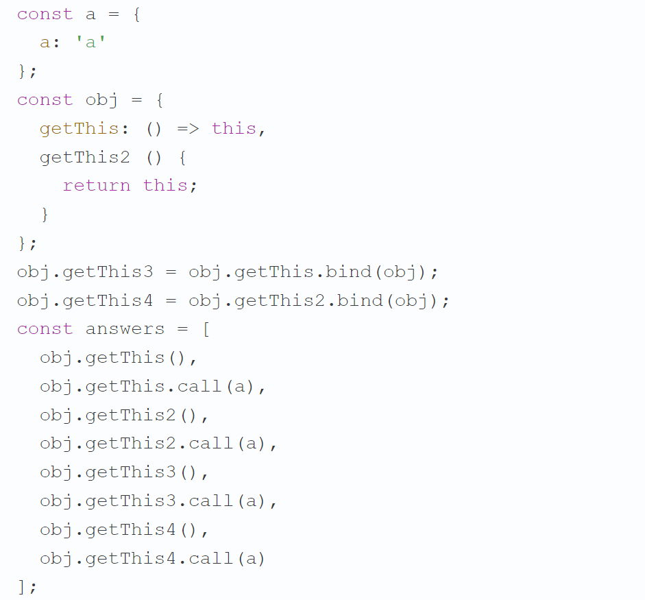 Разберём эту задачу, начав с первого примера. Конструкция obj.getThis() возвращает undefined. Почему? К стрелочной функции this привязать нельзя. Такие функции используют this из окружающей их лексической области видимости. Метод вызывается в ES6-модуле, в его лексической области видимости this будет иметь значение undefined. По той же причине undefined возвратит и вызов obj.getThis.call(a). Значение this при работе со стрелочными функциями не может быть переназначено даже с помощью .call() или .bind(). Это значение всегда будет соответствовать this из лексической области видимости, в которой находятся такие функции.