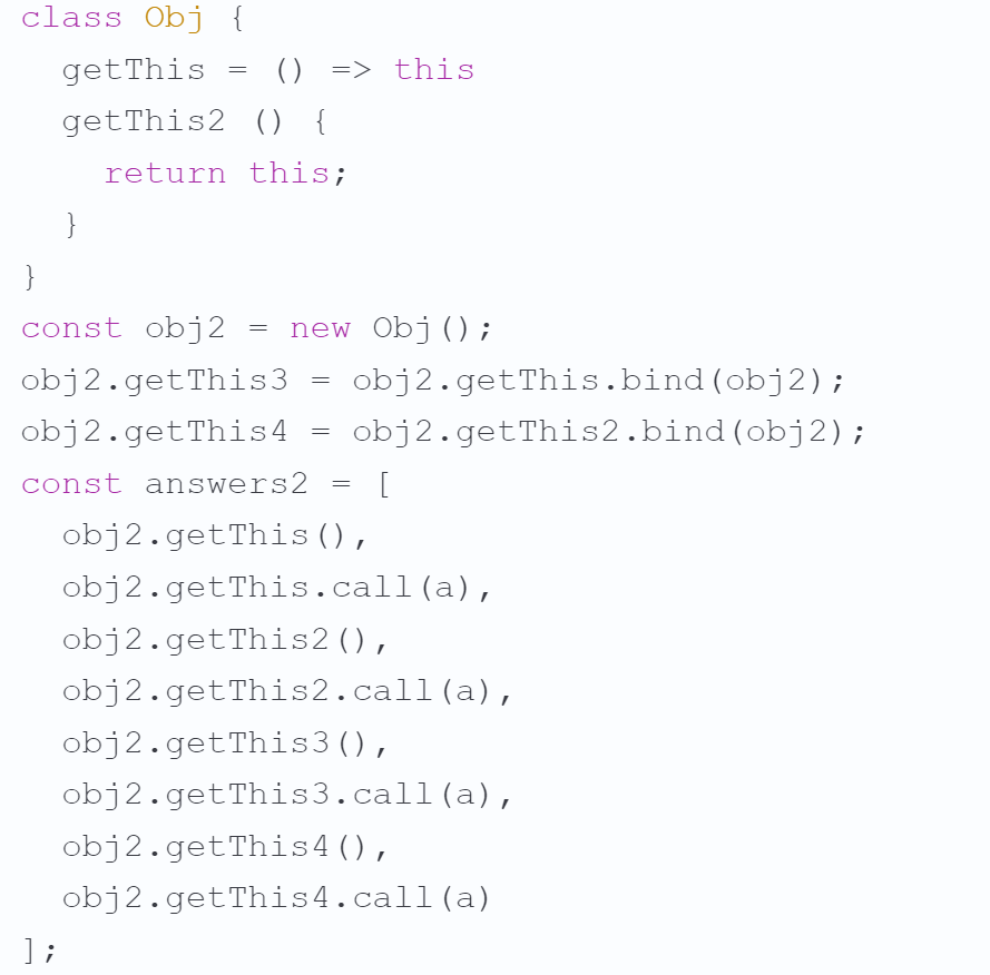 Здесь все вызовы методов, за исключением obj2.getThis2.call(a), вернут ссылку на экземпляр объекта. Этот же вызов вернёт объект a. Стрелочные функции всё ещё берут this из лексической области видимости. Разница между этим примером и предыдущим заключается в различии областей видимости, из которых берётся this.