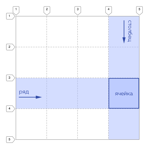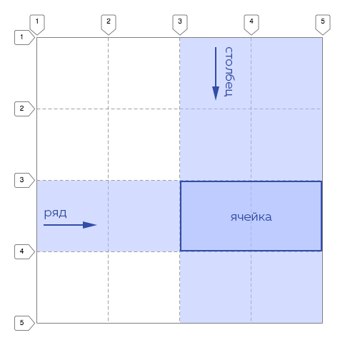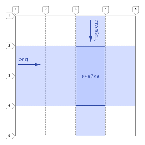 На примере выше ячейка начинается на 4 линии столбцов и 3 линии рядов.