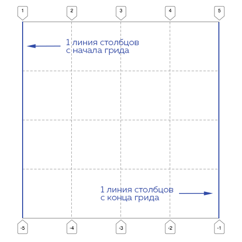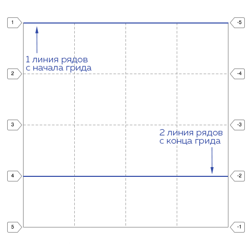 Интересной особенностью грид-ячейки является возможность начинать отсчёт её координат как от начала (первой линии ряда или столбца), так и от конца грида (последней линии ряда или столбца). Вот как это выглядит схематично: