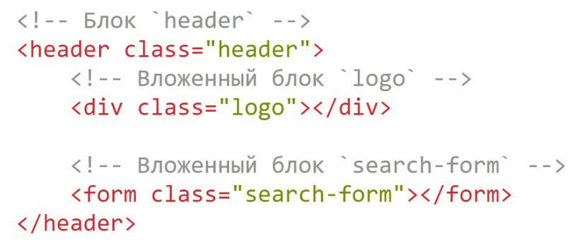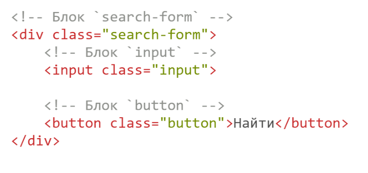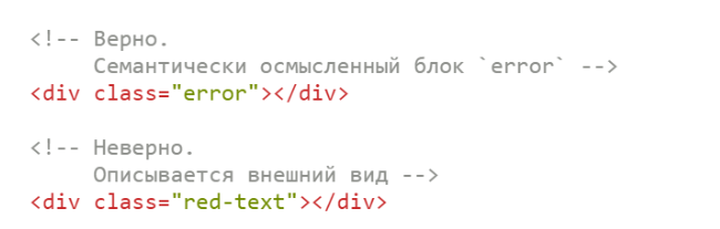- Название блока характеризует смысл («что это?» — «меню»: menu, «кнопка»: button), а не состояние («какой, как выглядит?» — «красный»: red, «большой»: big).