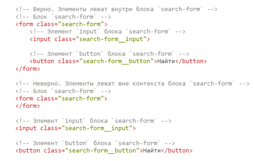 - Это означает, что в названии элементов нельзя прописывать иерархию вида block__elem1__elem2.