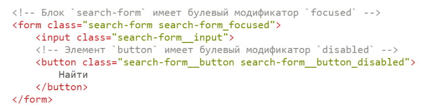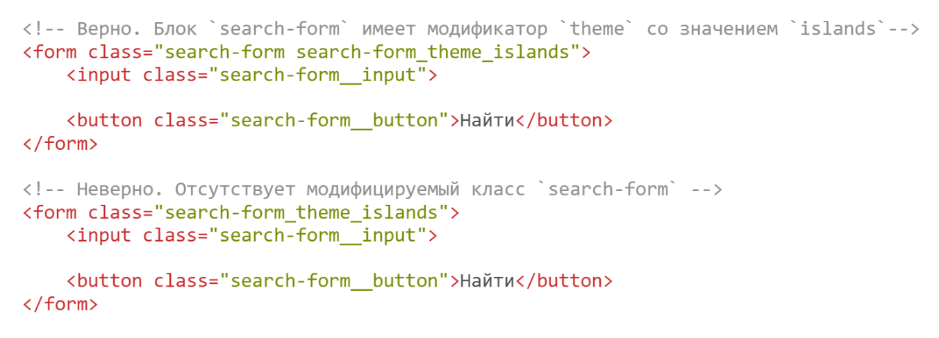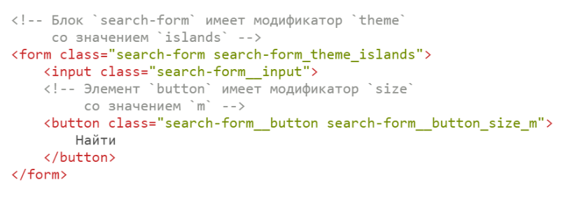- Название модификатора характеризует внешний вид («какой размер?», «какая тема?» и т. п. — «размер»: size_s, «тема»: theme_islands), состояние («чем отличается от прочих?» — «отключен»: disabled, «фокусированный»: focused) и поведение («как ведет себя?», «как взаимодействует с пользователем?» — «направление»: directions_left-top).