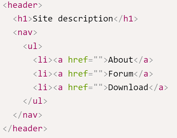 Группирует вводные и навигационные элементы, не является обязательным. Может содержать заголовки, оборачивать содержание раздела страницы, форму поиска или логотип. В HTML-документе может содержаться одновременно несколько элементов <header> и они могут располагаться в любой части страницы.