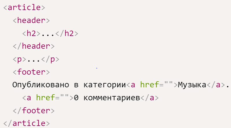 Тут мы добавили две части связанного контента к главной <article> контента. Используя aside, мы определяем то, что связанный контента (aside) опционален. То есть основная секция контента может быть показана без aside и все равно будет понятна.