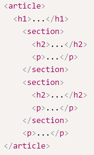 Тут есть охватывающая всё <article>, которая определяет центральный контент внутри тега <main>. Это даёт краткий обзор темы этой части страницы. В этой <article> мы имеем несколько под-тем, которые формируют основную тему, которая определяет вложенными секциями.