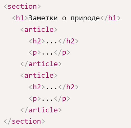 Можно создавать родительские элементы <section> с вложенными элементами <article>, в которых есть один или несколько элементов <article>. Не все страницы должны быть устроены именно так, но это допустимый способ вложения элементов. Например, основная область контента страницы содержит два блока со статьями разной тематики. Можно сделать на этом акцент, поместив каждую статью одной тематики внутрь элемента <section>
