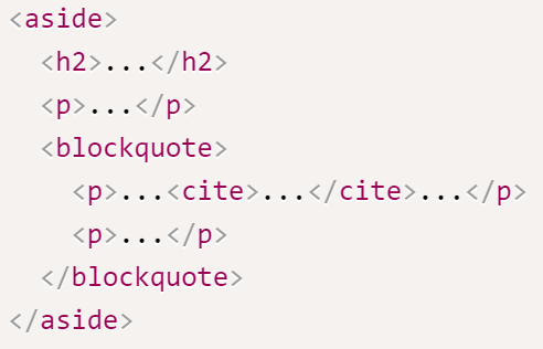 Группирует содержимое, связанное с окружающим его контентом напрямую, но которое можно счесть отдельным (т.е., удаление этого блока не повлияет на понимание основного содержимого). Чаще всего элемент позиционируется как боковая колонка (как в книгах) и включает в себя группу элементов: <nav>, цифровые данные, цитаты, рекламные блоки, архивные записи. Не подходит для блоков, просто позиционированных в стороне.