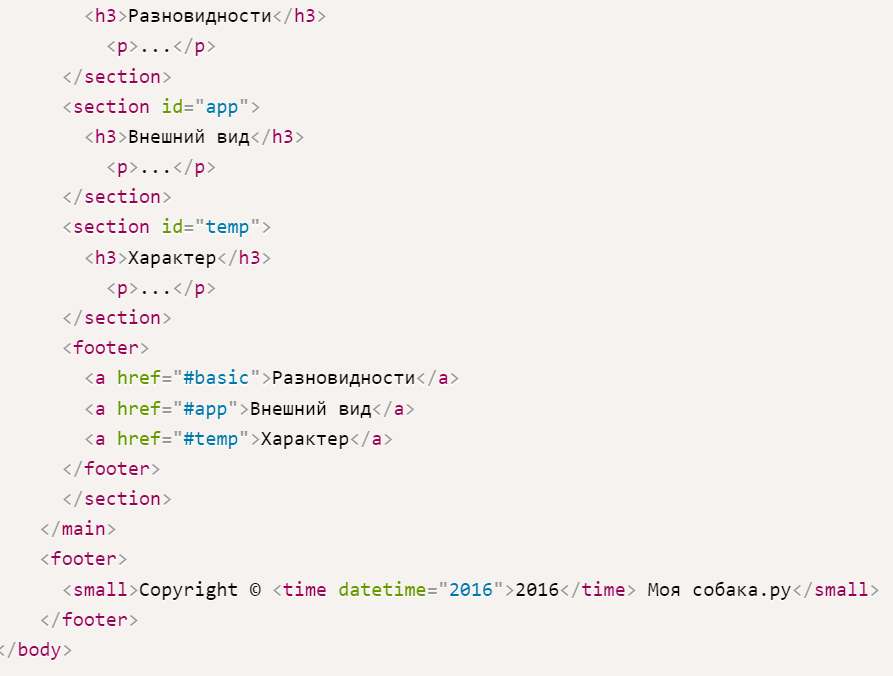 Представляет собой нижний колонтитул содержащей его секции или корневого элемента. Обычно содержит информацию об авторе статьи, данные о копирайте и т.д. Если используется как колонтитул всей страницы, содержимое дополняется сведениями об авторских правах, ссылками на условия использования, контактную информацию, ссылками на связанное содержимое и т.п.
