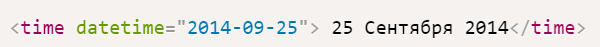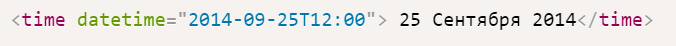 Определяет время (24 часа) или дату по григорианскому календарю с возможным указанием времени и смещения часового пояса. Текст, заключенный в данный тег, не имеет стилевого оформления браузером. Для тега доступен атрибут datetime, в качестве содержимого которого указывается то, что будет видеть пользователь на экране своего компьютера: