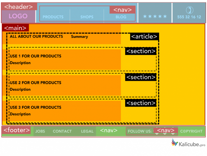 Обратите внимание, что эти теги ведут себя как <div> теги, что говорит о том, что они могут заменить существующие <div> без влияния на общий макет. В большинстве случаев применение семантического HTML5 может быть легко применено нахождением подходящей пары <div> и </div> и её заменой.