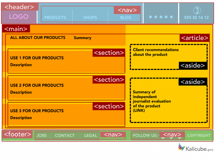 Семантический HTML5 устраняет этот недостаток, определяя точные теги для пояснения четкой роли контента на странице. Эта дополнительная информация помогает роботам/индексаторам, таким как Google и Bing лучше понять какой контент важен, какой является второстепенным, какой используется для навигации и так далее. Добавляя семантические HTML теги на ваши страницы, вы даете дополнительную информацию, которая помогает поисковикам понимать роли и относительную важность разных частей ваших страниц.