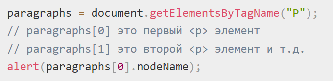 Например: стандарт DOM описывает, что метод getElementsByTagName в коде, указанном ниже, должен возращать список всех элементов <p> в документе.