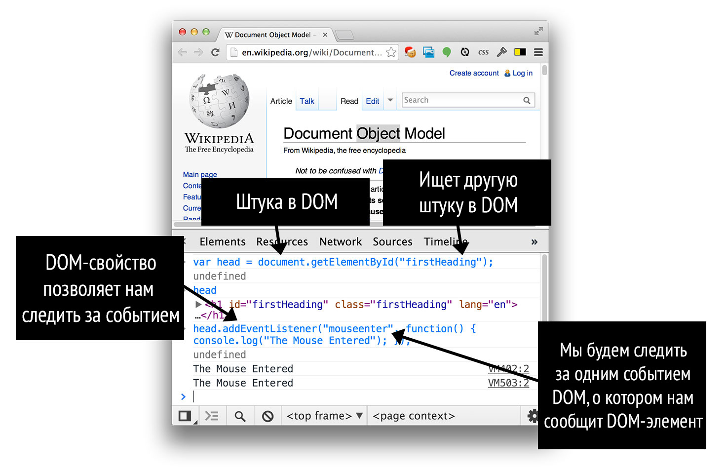 Например, мы можем написать код на JavaScript, который будет следить за срабатыванием события mouseenter на элементе. Этот элемент есть ни что иное, как узел DOM-дерева, и к этому узлу мы с помощью DOM-свойства подключаем обработчик. Срабатывание события происходит потому, что узел DOM-дерева распространяет его.
