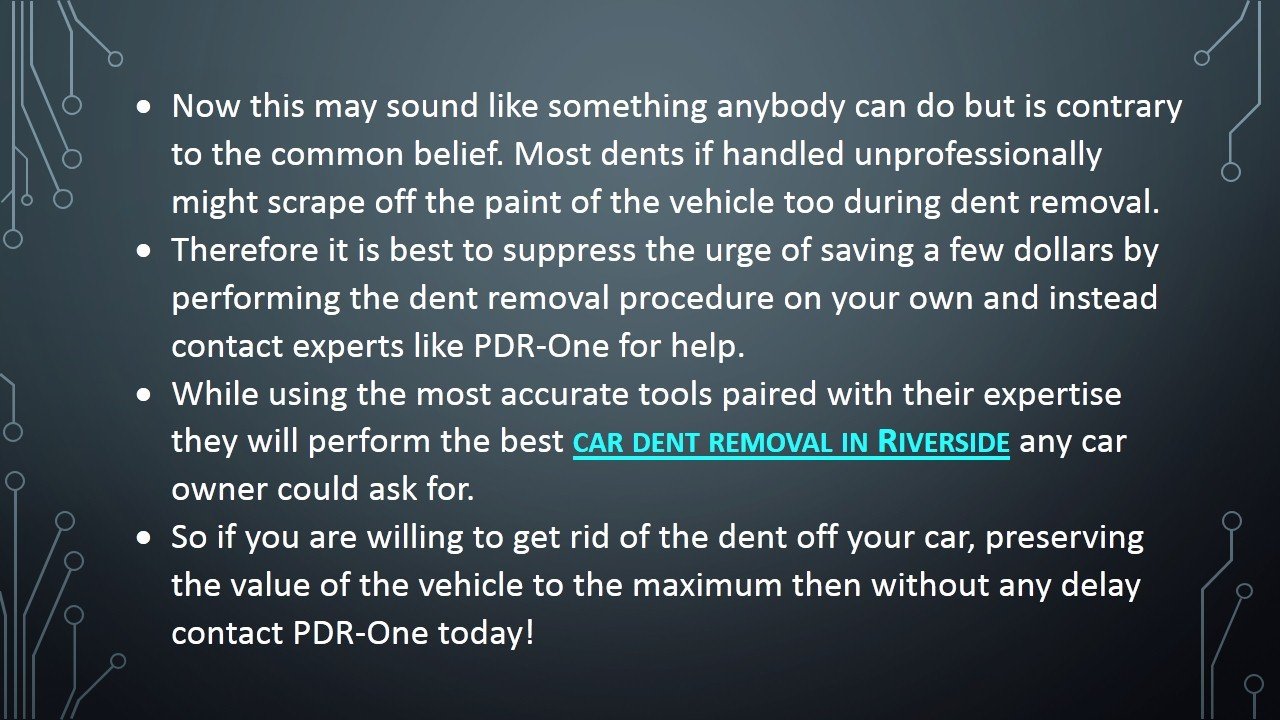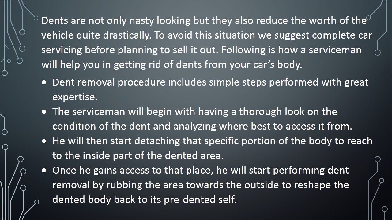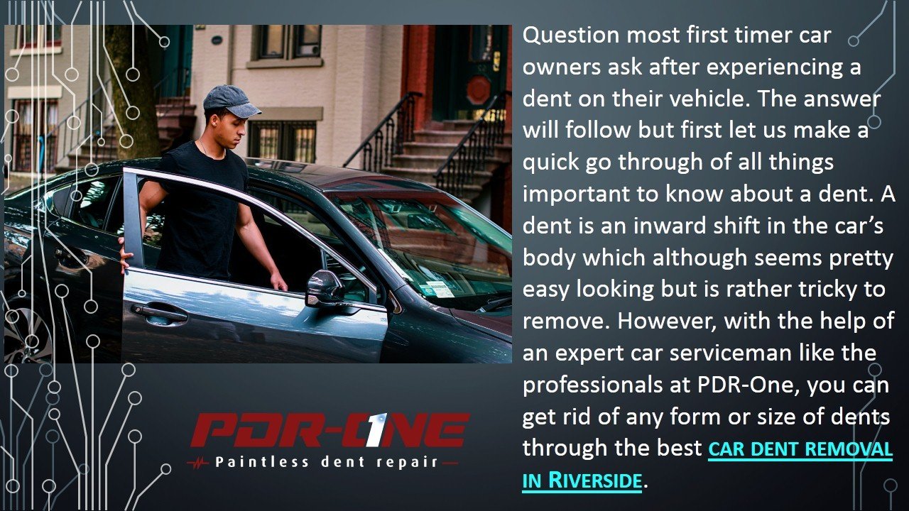 Question most first timer car owners ask after experiencing a dent on their vehicle. The answer will follow but first let us make a quick go through of all things important to know about a dent. A dent is an inward shift in the car’s body which although seems pretty easy looking but is rather tricky to remove. However, with the help of an expert car serviceman like the professionals at PDR-One, you can get rid of any form or size of dents through the best CAR DENT REMOVAL IN RIVERSIDE. Dents are not only nasty looking but they also reduce the worth of the vehicle quite drastically. To avoid this situation we suggest complete car servicing before planning to sell it out. Following is how a serviceman will help you in getting rid of dents from your car’s body.