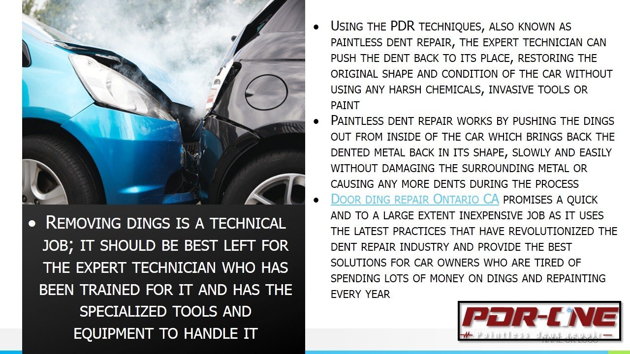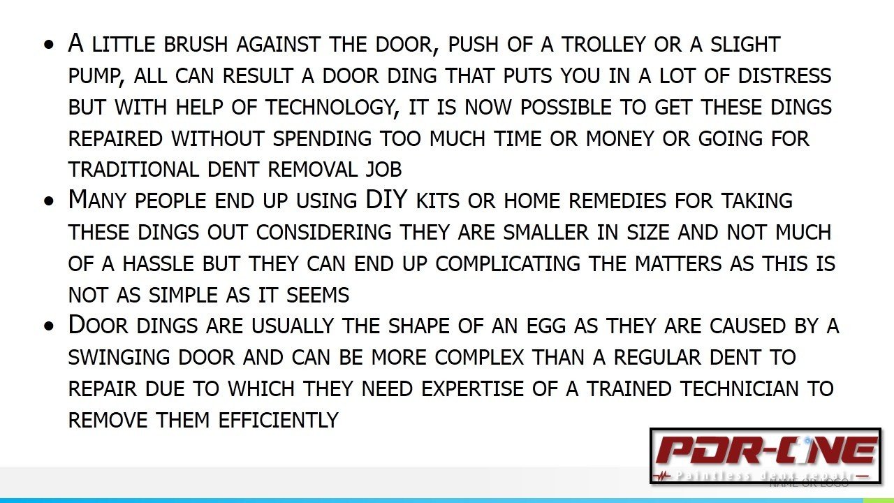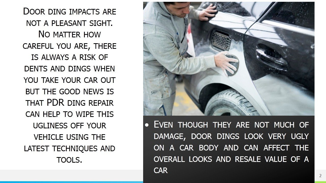 Door ding impacts are not a pleasant sight. No matter how careful you are, there is always a risk of dents and dings when you take your car out but the good news is that PDR ding repair can help to wipe this ugliness off your vehicle using the latest techniques and tools. • Even though they are not much of damage, door dings look very ugly on a car body and can affect the overall looks and resale value of a car • A little brush against the door, push of a trolley or a slight pump, all can result a door ding that puts you in a lot of distress but with help of technology, it is now possible to get these dings repaired without spending too much time or money or going for traditional dent removal job • Many people end up using DIY kits or home remedies for taking these dings out considering they are smaller in size and not much of a hassle but they can end up complicating the matters as this is not as simple as it seems • Door dings are usually the shape of an egg as they are caused by a swinging door and can be more complex than a regular dent to repair due to which they need expertise of a trained technician to remove them efficiently • Removing dings is a technical job; it should be best left for the expert technician who has been trained for it and has the specialized tools and equipment to handle it • Using the PDR techniques, also known as paintless dent repair.