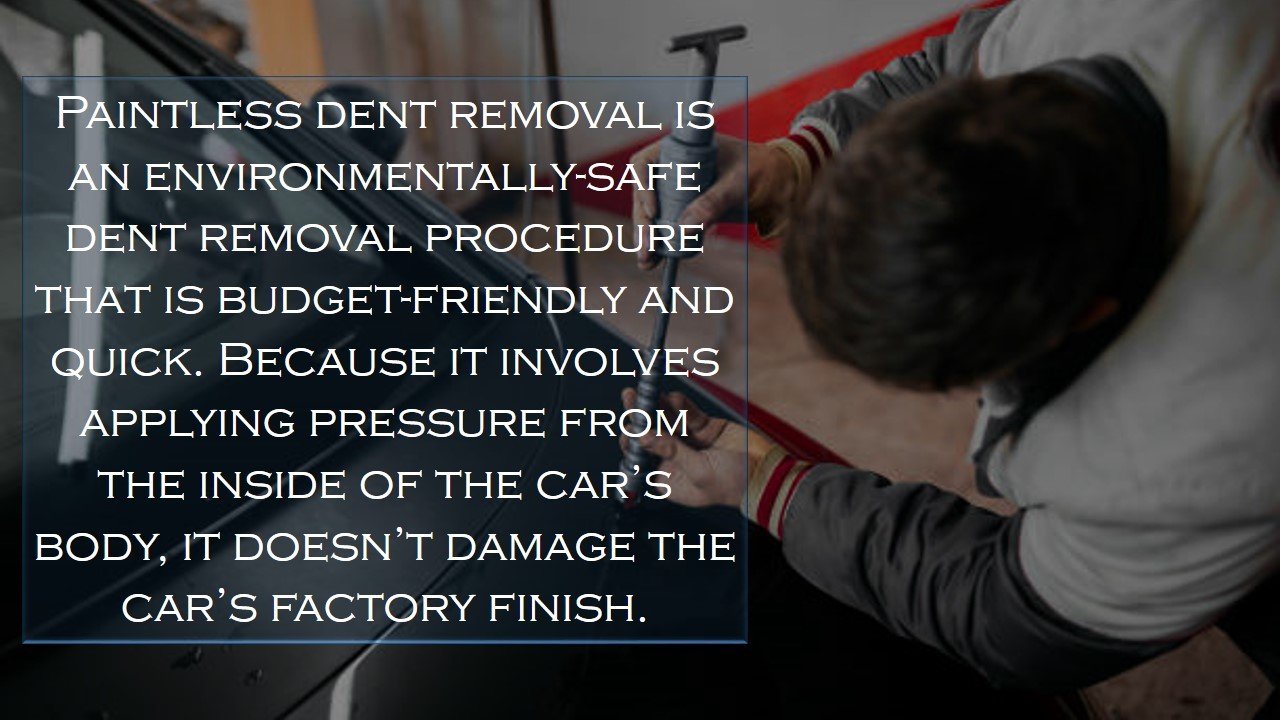 Paintless dent removal is an environmentally-safe dent removal procedure that is budget-friendly and quick. Because it involves applying pressure from the inside of the car’s body, it doesn’t damage the car’s factory finish.