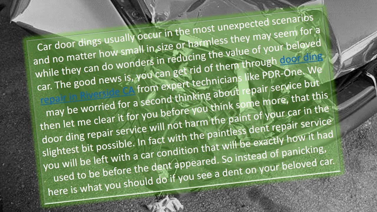 "Car door dings usually occur in the most unexpected scenarios and no matter how small in size or harmless they may seem for a while they can do wonders in reducing the value of your beloved car. The good news is, you can get rid of them through door ding repair in Riverside CA from expert technicians like PDR-One. We may be worried for a second thinking about repair service but then let me clear it for you before you think some more, that this door ding repair service will not harm the paint of your car in the slightest bit possible. In fact with the paintless dent repair service you will be left with a car condition that will be exactly how it had used to be before the dent appeared. So instead of panicking, here is what you should do if you see a dent on your beloved car."