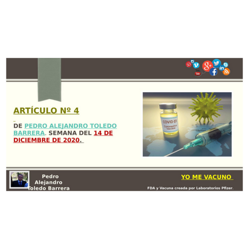 En esta presentación hablaré del "Artículo Nº 4 de Pedro Toledo. Semana del 14 de diciembre de 2020". Así que sigamos con el tema ... YO ME VACUNO FDA y Vacuna creada por Laboratorios Pfizer.