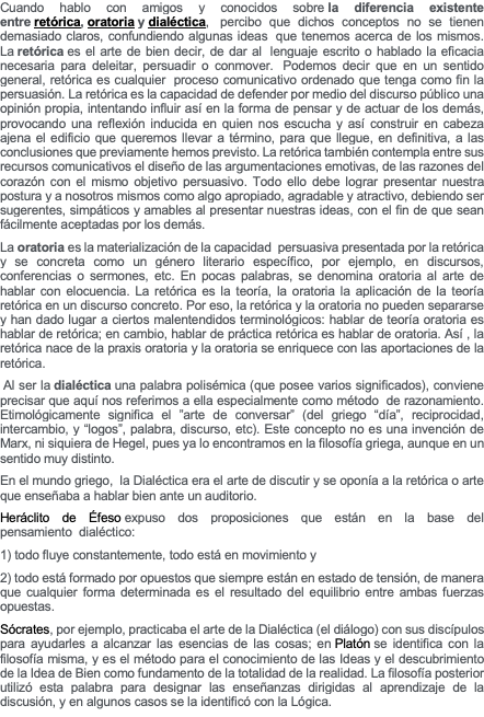 Cuando hablo con amigos y conocidos sobre la diferencia existente entre retórica, oratoria y dialéctica, percibo que dichos conceptos no se tienen demasiado claros, confundiendo algunas ideas que tenemos acerca de los mismos. La retórica es el arte de bien decir, de dar al lenguaje escrito o hablado la eficacia necesaria para deleitar, persuadir o conmover. Podemos decir que en un sentido general, retórica es cualquier proceso comunicativo ordenado que tenga como fin la persuasión. La retórica es la capacidad de defender por medio del discurso público una opinión propia, intentando influir así en la forma de pensar y de actuar de los demás, provocando una reflexión inducida en quien nos escucha y así construir en cabeza ajena el edificio que queremos llevar a término, para que llegue, en definitiva, a las conclusiones que previamente hemos previsto. La retórica también contempla entre sus recursos comunicativos el diseño de las argumentaciones emotivas, de las razones del corazón con el mismo objetivo persuasivo. Todo ello debe lograr presentar nuestra postura y a nosotros mismos como algo apropiado, agradable y atractivo, debiendo ser sugerentes, simpáticos y amables al presentar nuestras ideas, con el fin de que sean fácilmente aceptadas por los demás. La oratoria es la materialización de la capacidad persuasiva presentada por la retórica y se concreta como un género literario específico, por ejemplo, en discursos, conferencias o sermones, etc. En pocas palabras, se denomina oratoria al arte de hablar con elocuencia. La retórica es la teoría, la oratoria la aplicación de la teoría retórica en un discurso concreto. Por eso, la retórica y la oratoria no pueden separarse y han dado lugar a ciertos malentendidos terminológicos: hablar de teoría oratoria es hablar de retórica; en cambio, hablar de práctica retórica es hablar de oratoria. Así , la retórica nace de la praxis oratoria y la oratoria se enriquece con las aportaciones de la retórica. Al ser la dialéctica una palabra polisémica (que posee varios significados), conviene precisar que aquí nos referimos a ella especialmente como método de razonamiento. Etimológicamente significa el ”arte de conversar” (del griego “día”, reciprocidad, intercambio, y “logos”, palabra, discurso, etc). Este concepto no es una invención de Marx, ni siquiera de Hegel, pues ya lo encontramos en la filosofía griega, aunque en un sentido muy distinto. En el mundo griego, la Dialéctica era el arte de discutir y se oponía a la retórica o arte que enseñaba a hablar bien ante un auditorio. Heráclito de Éfeso expuso dos proposiciones que están en la base del pensamiento dialéctico: 1) todo fluye constantemente, todo está en movimiento y 2) todo está formado por opuestos que siempre están en estado de tensión, de manera que cualquier forma determinada es el resultado del equilibrio entre ambas fuerzas opuestas. Sócrates, por ejemplo, practicaba el arte de la Dialéctica (el diálogo) con sus discípulos para ayudarles a alcanzar las esencias de las cosas; en Platón se identifica con la filosofía misma, y es el método para el conocimiento de las Ideas y el descubrimiento de la Idea de Bien como fundamento de la totalidad de la realidad. La filosofía posterior utilizó esta palabra para designar las enseñanzas dirigidas al aprendizaje de la discusión, y en algunos casos se la identificó con la Lógica. En Marx, la dialéctica designa tanto el proceso peculiar con el que se desenvuelve la sociedad a lo largo de su propia historia, como el modo en que se debe pensar para captar adecuadamente dicho proceso. Finalmente, según Hegel, la dialéctica afirma que cada pensamiento, cada idea y cada situación en el mundo tiene un contrario, y que la unión con él forma un todo mayor y más complejo. Hegel siguió la tradición que procede de Heráclito (hacia el 500 a. C.), quién veía todo como un producto de un proceso del que surge el progreso de la historia. Como ninguna situación puede continuar indefinidamente, y cada situación contiene elementos que entran en conflicto, el cambio es continuo. El proceso de cambio es la dialéctica.