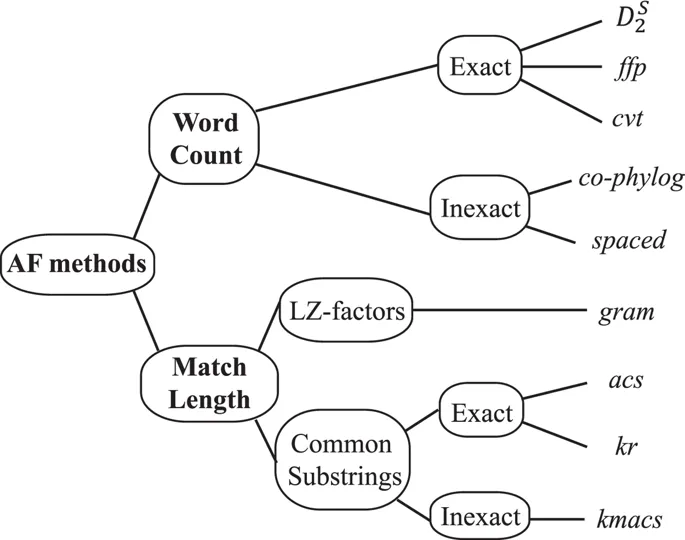 - Dai and colleagues (2008) demonstrated that AF methods detected statistically relevant similarities in sequence compositions in contrast to traditional methods that showed only limited correspondence recognizable by alignments;