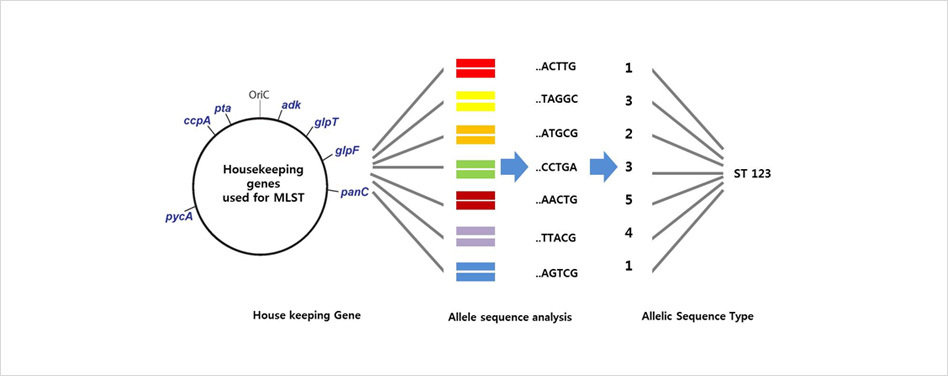 - Defined scheme of typically 7 housekeeping gene fragments.
