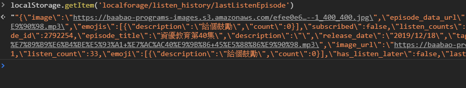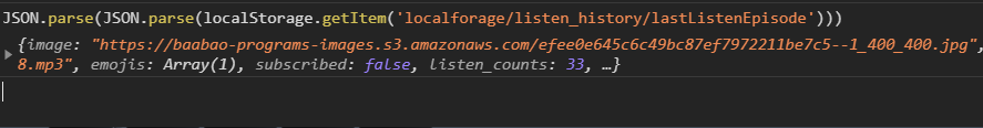 $jsCode = "JSON.parse(JSON.parse(localStorage.getItem('localforage/listen_history/lastListenEpisode')))";