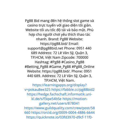 Website: https://pg88.bid/. Pg88 Bid mang đến hệ thống slot game và casino trực tuyến với giao diện tối giản. Website tối ưu tốc độ tải và bảo mật. Phù hợp cho người chơi yêu thích thao tác nhanh. Brand: Pg88 Website: https://pg88.bid/ Email: suppo