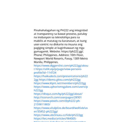 Website: https://ph222.gg/https://ph222.gg/ Pinahahalagahan ng PH222 ang integridad at transparency sa bawat proseso, patuloy na inobasyon sa teknolohiya para sa mabilis at matatag na karanasan, at isang user-centric na diskarte na inuuna ang pagiging simple at kagi
