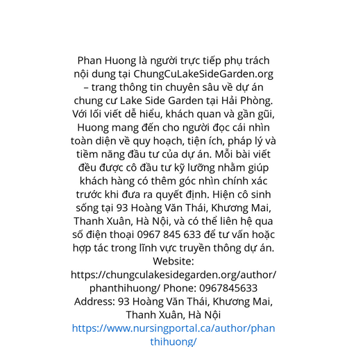 Website: https://chungculakesidegarden.org/author/phanthihuong/ Phan Huong là người trực tiếp phụ trách nội dung tại ChungCuLakeSideGarden.org – trang thông tin chuyên sâu về dự án chung cư Lake Side Garden tại Hải Phòng. Với lối viết dễ hiểu, khách