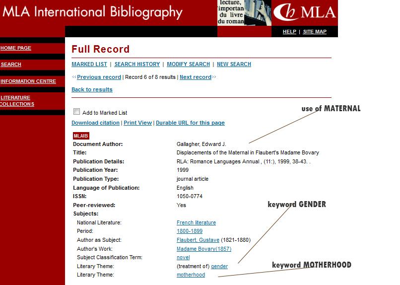 for example, let's say you are interested in Emma Bovary's disinterest in baby Berthe. Is she the 19th century equivalent of a desperate housewife? You could combine the following terms: