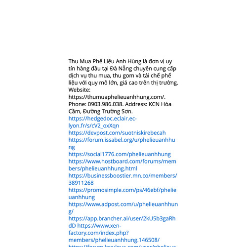 Website: https://thumuaphelieuanhhung.com/https://thumuaphelieuanhhung.com/ Thu Mua Phế Liệu Anh Hùng là đơn vị chuyên nghiệp tại khu vực Đà Nẵng chuyên thu mua và thu gom phế liệu với quy mô rộng, giá cao trên thị trường. Phone: 0903.986.038. Address: KCN Hòa Cầm, Đường Trường Sơ