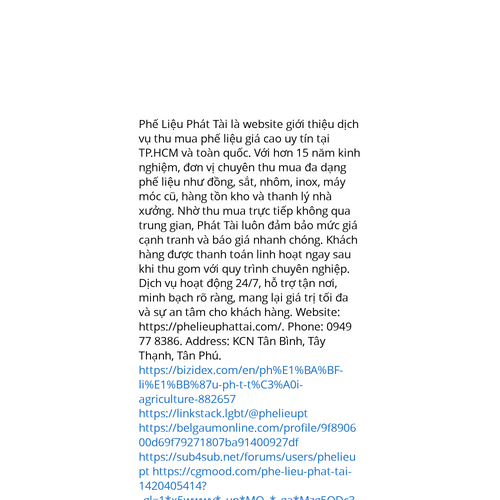 Website: https://phelieuphattai.com/https://phelieuphattai.com/ Phế Liệu Phát Tài là website giới thiệu dịch vụ thu mua phế liệu giá cao uy tín tại TP.HCM và toàn quốc. Sở hữu hơn 15 năm hoạt động, đơn vị nhận thu mua nhiều loại phế liệu gồm đồng, sắt, nhôm, inox, máy móc cũ,
