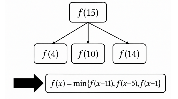 f(x) = min{ f(x-11), f(x-5), f(x-1) } + 1